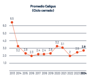 Durante 2024, el promedio de adultos móviles de Caligus en ciclo cerrado fue de 2,9, registrando un aumento respecto a 2023. Si bien la cifra se mantiene dentro de rangos manejables y por debajo de los niveles observados en años anteriores, refuerza la importancia de seguir fortaleciendo las estrategias de control integrado.