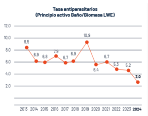 La evolución de la tasa de antiparasitarios (principio activo baño/biomasa LWE) evidencia una tendencia a la baja en el largo plazo. En 2024, la tasa alcanzó un valor de 3,0, manteniéndose por debajo de los niveles observados en años anteriores, lo que refleja el fortalecimiento de las estrategias sanitarias aplicadas por el sector.