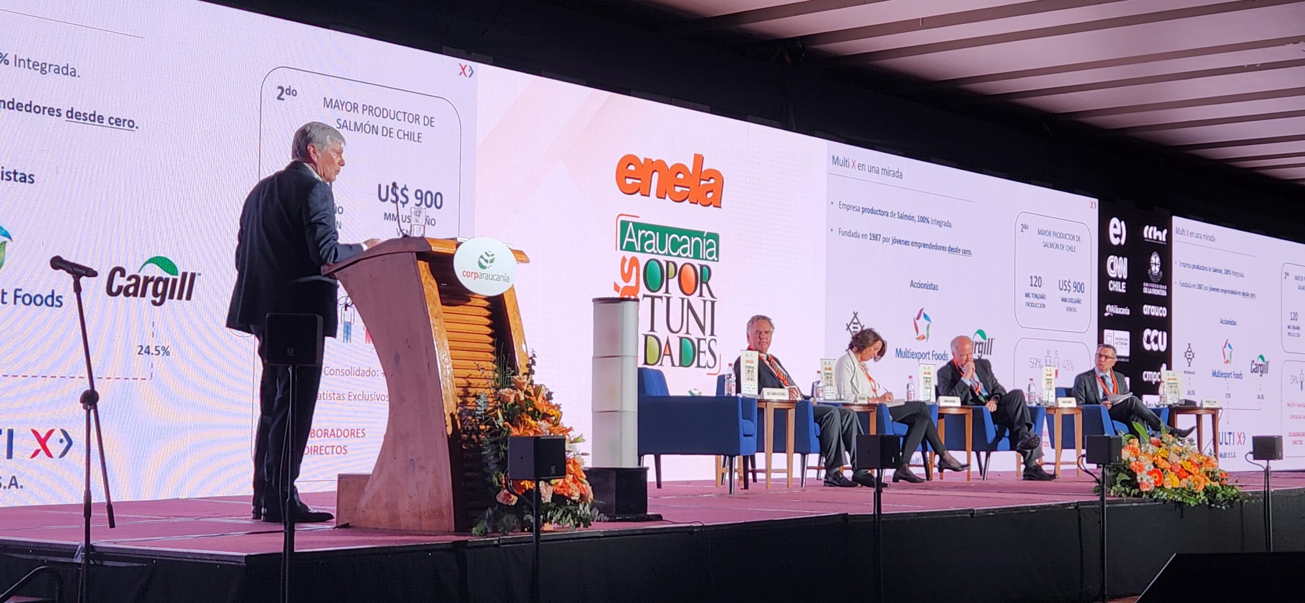 Durante el evento, el sector salmonicultor fue representado por el presidente ejecutivo de Multi-X y director de SalmonChile, José Ramón Gutierrez, quien participó en el panel “Araucanía más oportunidades”, en el que estuvieron presentes también el gerente general de Agrícola Alto Traiguén, Camilo Torrealba; la fundadora de Empresas Agrotop, Karina Von Baer; y el gerente corporativo de Personas y Sustentabilidad de Arauco, Charles Kimber.
