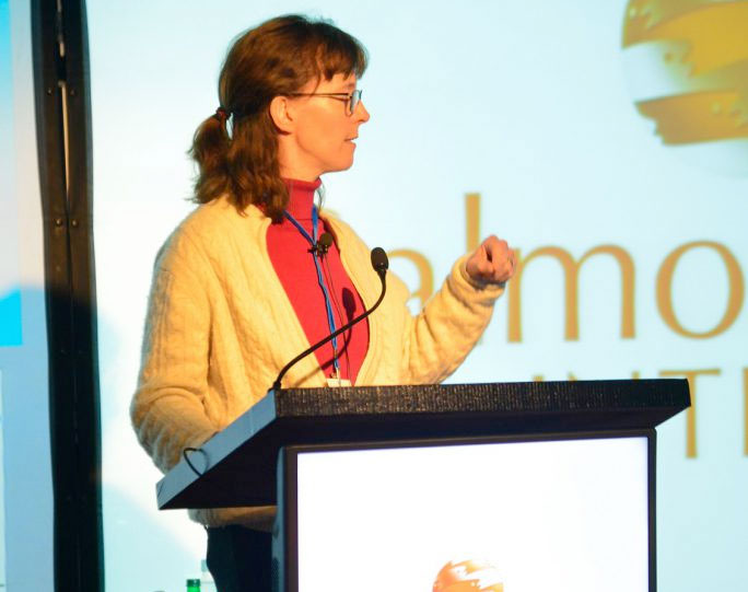 En el último bloque se orientó a analizar el SRS. El primero lugar fue para la Directora de Investigación de la Universidad Prince Edwards Island, Sophie St. Hilaire, quien expuso sobre los avances en el conocimiento de la epidemiologia de SRS en Chile. También participó Rodrigo Estévez, investigador de la Universidad Católica de Chile quien identificó los factores de riesgo y protectores para el SRS.