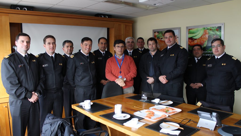 La delegación compuesta por 10 Oficiales alumnos del Curso de Gestión y Conducción Marítima de la Academia de Guerra de la Armada de Chile, provenientes de Valparaíso, tuvieron la oportunidad de conocer parte del proceso productivo de la industria del salmón, sector económico relevante en la zona sur del país, permitiéndoles profundizar sus conocimientos acerca del clúster, para finalizar sus estudios con un informe al respecto.